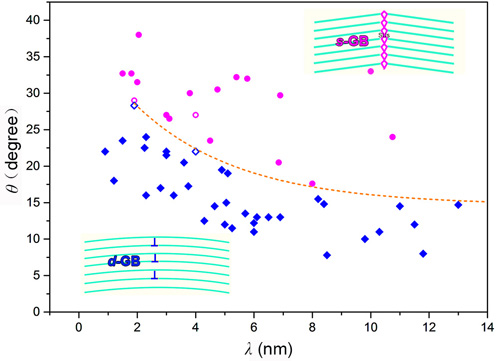 晶界是晶体材料中重要的缺陷之一。人们普遍认为在块体晶体材料中小角晶界(取向差小于15°)由位错墙构成,而大角晶界(取向差大于15°)则以结构单元而不是位错的形式存在。随着晶体材料的尺寸逐渐减小,大量存在的表面对材料的结构和变形行为会产生显著影响。