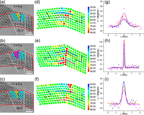 研究结果表明,当纳米线直径大于10纳米时,取向差小于15°的晶界以位错型(DGB)形式存在,而取向差大于15°的晶界以结构单元型(SGB)存在,与块体材料相似。随着纳米线直径减小到10纳米以下, 位错型与结构单元型晶界的临界取向差将大于15°并且随纳米线直径减小而增大。当纳米线直径为2纳米时,取向差为28.6°的大角晶界仍然以位错型的形式存在。定量应变分析发现,位错型晶界的周围存在明显的弹性应变场而结构单元型晶界周围没有,这使得位错型晶界的宽度明显宽于结构单元型,这个特征可以用来区别这两种晶界。原位像差校正电子显微学研究表明,尺寸效应形成的位错型晶界可以在外加应力作用下以位错墙滑移的方式进行晶界迁移,从而避免了传统大角晶界的晶界滑移,这有效地提高了纳米线的力学稳定性。原位透射电镜形变和电学测量结果表明,纳米线中位错型晶界导致的电阻增加远低于结构单元型晶界,这也提高了纳米线的导电稳定性。这一原子尺度的原位定量电子显微学研究揭示了超纳尺度小尺寸金属材料中晶界结构的尺寸效应,这一效应同时提高了材料的力学及电学稳定性,因而可能为微电子互连以及纳米器件的设计提供新的思路。