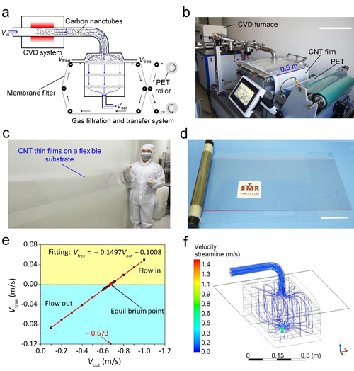 图1 米级单壁碳纳米管薄膜的制备。(a)碳纳米管连续合成、沉积和转移过程示意图。(b)实验装置图。(c)柔性PET衬底上的单壁碳纳米管薄膜。(d)一卷单壁碳纳米管薄膜。(e)气体速度的仿真曲线。(f)平衡状态的气流分布仿真结果。