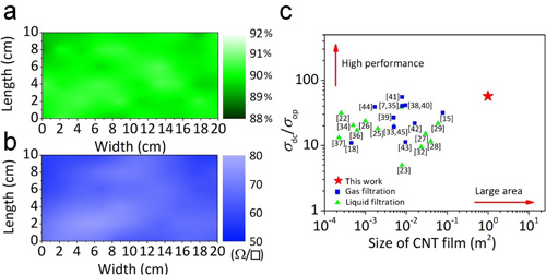 图2 单壁碳纳米管薄膜光电性能表征。(a)透光率面分布表征。(b)方块电阻面分布表征。(c)薄膜性能的对比结果。