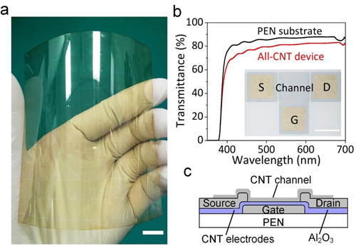 图3 大面积柔性全碳器件。(a)柔性透明全碳器件照片。(b)器件光学透过率曲线。(c)全碳TFT结构示意图。