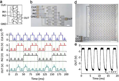 图4 全碳逻辑门和环形振荡器。(a)异或门。(b)异或门光学照片。(c)异或门输入输出特性曲线。(d)101阶环形振荡器光学照片。(e)101阶环形振荡器输入输出曲线。