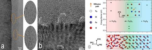 图1 钝化膜中晶体/非晶界面作为氯离子在膜中的传输通道。(a)沿基体[001]晶带轴的TEM高分辨像显示钝化膜主要为非晶态,其中包含有一些纳米晶;(b)界面处TEM高分辨像的局部放大图;(c)氯离子在钝化膜中的晶体、非晶及二者界面处进行扩散所需能量的第一原理计算。
