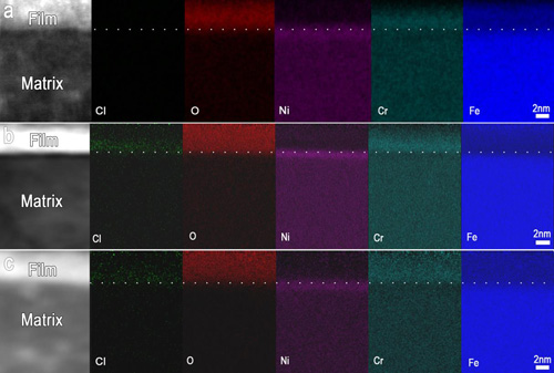 图2 氯离子进入并穿透钝化膜,富集在钝化膜/基体界面处。不同形成条件下钝化膜的元素面分布分析,(a)在0.5 mol L-1 H2SO4 溶液中640 mV / SHE 下恒电位钝化30分钟; (b) 在0.5 mol L-1 H2SO4 + 0.3 mol L-1 NaCl 溶液中640 mV / SHE 下恒电位钝化30分钟; (c) 先在0.5 mol L-1 H2SO4 溶液中640 mV / SHE 下恒电位钝化30分钟,然后向溶液中加入NaCl溶液。