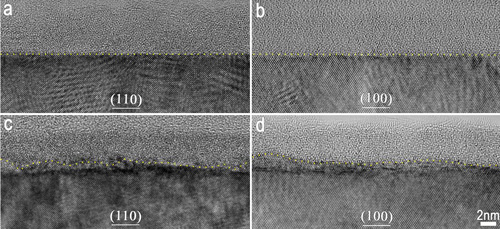 图3 氯离子作用于界面导致基体/钝化膜界面的起伏。(a-b)沿基体[001]及[110]带轴的TEM高分辨像,钝化膜为在0.5 mol/ L H2SO4 溶液中生长在(110)及(001)面上;(c)沿基体[001]带轴的TEM高分辨像,钝化膜为在0.3 mol L-1 NaCl + 0.5 mol L-1 H2SO4 溶液中生长在(110)面上;(d)沿基体[110]带轴的TEM高分辨像,钝化膜为先在0.5 mol L-1 H2SO4 溶液中形成,然后向溶液中加入NaCl溶液。