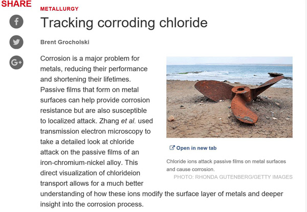 耀彩网固体原子像研究部马秀良研究员、张波副研究员和王静博士等人组成的介质条件下材料电子显微学研究小组在原子尺度下直接获得金属表面超薄钝化膜的剖面显微图像,并揭示了氯离子击破钝化膜的作用机制。7月2日,英国《自然 通讯》(Nature Communications)在线发表了该项研究成果。9月7日,美国《科学》(Science)周刊在相关专栏以“Tracking corroding chloride”为题对该成果进行了推介,认为“利用透射电子显微技术对氯离子传输的直接观测加深了对金属腐蚀过程的理解”。