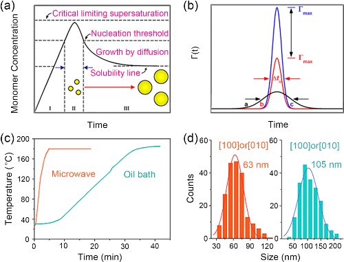)对应形核时间窗口。(c)微波加热和油浴加热两种加热模式下的原位温度与时间曲线。(d)由两种不同的加热模式制备的LiFePO4沿[100]或[010]方向的尺寸统计。微波加热的尺寸为63nm,而在常规油浴加热的情况下,尺寸为105nm。