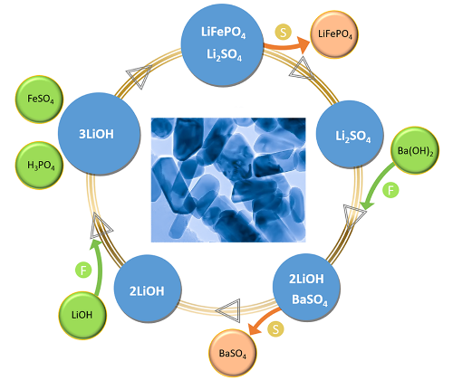 图2 LiFePO4纳米晶水热合成路线及锂回收示意图。以LiOH、FeSO4和H3PO4为原料制备纳米LiFePO4。用Ba(OH)2做沉淀剂与滤液反应,随后进行固液分离,回收LiOH。插图为LiFePO4的TEM照片。