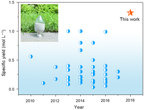图3 水热/溶剂热合成方法制备LiFePO4单位体积产率的比较。插图为本工作中合成的LiFePO4的光学照片。