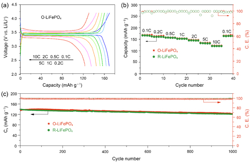 图4 原始的O-LiFePO4/C和回收的R-LiFePO4/C的电化学性能曲线。(a)O-LiFePO4/C在0.1–10C不同倍率围内的典型充放电曲线。(b)倍率性能。(c)O-LiFePO4/C和R-LiFePO4/C在3C倍率下的长循环稳定性。3C对应的充电或放电时间为20分钟。