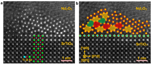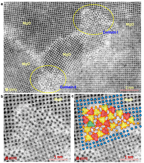 陈春林研究员等人利用扫描透射电子显微术与第一性原理理论计算相结合的方法,在MgO和Nd2O3薄膜材料中发现了一维有序晶体,更新了人们对固态物质结构的认识。该结构仅在一个方向上保留了晶体的平移对称性和周期性,在其他方向上其原子呈现无序排列,形成了具有一维平移周期性的长程有序结构。构成一维有序晶体的结构单元的原子排列与重位点阵倾转晶界的结构单元非常类似。研究表明,尽管MgO晶体是能隙为7.4 eV的绝缘体,MgO一维有序晶体则是能隙为3.2eV的宽带半导体。一维有序晶体的发现表明固态物质结构的种类比人们的已有认知更加丰富,并且新结构的物理性质与相应常见结构类型具有显著差异。
