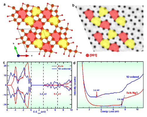 图3 DFT理论计算与STEM-EELS分析确定MgO一维有序晶体的原子与电子结构。MgO晶体是能隙为7.4 eV的绝缘体,MgO一维有序晶体则是能隙为3.2eV的宽带半导体。