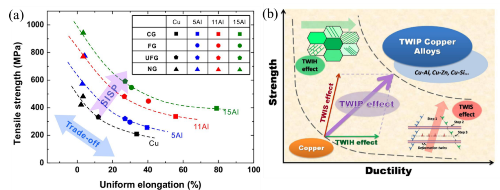 图2 铜合金同步强韧化的层错能效应:(a)不同铝含量铜铝合金强度塑性倒置关系;(b)铜合金TWIP效应示意