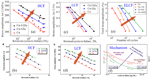 图3 铜合金疲劳性能提升的层错能效应:(a-c)超细晶铜铝及铜锌合金高周与低周疲劳寿命曲线;