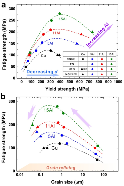 图4 不同成分与组织铜铝合金疲劳强度随拉伸强度(a)与晶粒尺寸(b)的变化