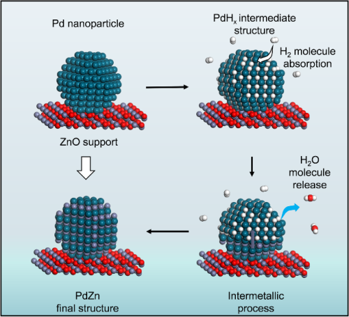 , P4/mmm)是甲醇重整、水煤气转换、烷烃脱氢和选择性加氢等反应的高效催化剂,其展现优异性能的原因是钯和锌在空间上分隔的几何结构及调制的钯电子结构。研究人员已对负载型金属间化合物结构的形成过程进行了大量研究,但由于表征方法限制,一直缺乏对其关键形成步骤和因素的揭示,因而其可控合成及实际应用仍存在困难。