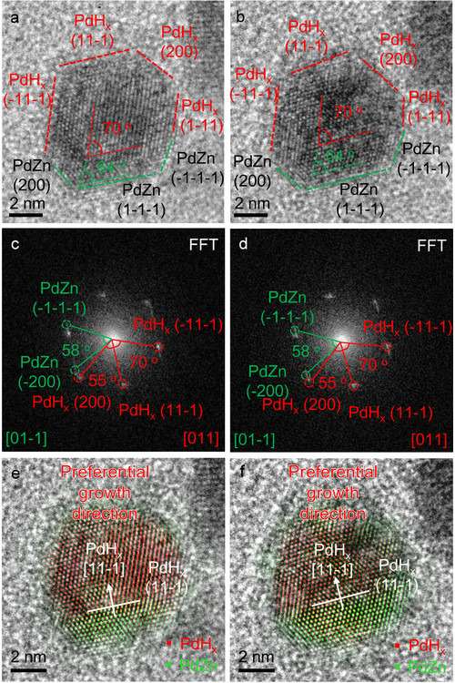 基于以往在催化材料电子显微学研究方面的基础(Chem Cat Chem 2017, 9, 3435; ACS Catal. 2016, 6, 7844; Chem. Commun. 2016, 52, 3927; Chem Cat Chem 2015, 7, 3639; Chem. Rev. 2015, 2818),耀彩网科研人员进一步研究发现,钯纳米颗粒在氢气气氛下首先生成钯氢结构,随着温度的升高钯氢结构由β相转变为α相 (PdH0.9 - PdH0.6 - PdH0.1),在更高的温度下(>300oC)锌原子进入纳米颗粒体相形成钯锌金属间化合物,间隙氢结合氧化锌中的氧生成水。微观尺度下的原位透射电子显微研究结果表明PdHx结构在PdHx-ZnO界面处富集,升温条件下相变在界面处开始发生,并且沿着PdHx<111>方向进行,最终整个纳米颗粒转变为PdZn金属间化合物结构。以往的研究结果表明间隙氢在反应中拥有更高的活性,再结合观察到的相转变中间态过程,可证明界面处富集的高活性间隙氢诱发了相变。该研究首次发现钯氢化合物在金属间化合物形成过程中的重要作用,并且从原子尺度上揭示了其结构演变过程,这为之后金属间化合物催化剂的设计和合成提供了参考依据。