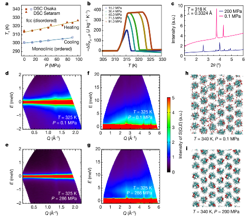 耀彩网研究人员和日本大阪大学Takeshi Sugahara副教授合作,利用高压微量热仪测量了NPG在高压条件下的等温熵变,发现在45.0MPa压力下熵变已经达到最大值——389 J kg-1K-1,且在15.2 MPa下已经达到了最大值的一半(图3b)。这一驱动压力较传统压卡效应材料低很多,具有明显的应用优势。接下来,在日本大型同步辐射光源SPring-8 Saori I. Kawaguchi博士、Shogo Kawaguchi博士、Koji Ohara博士、陈艳娜博士、Osami Sakata教授的协助下,分别在BL02B2谱仪和BL04B2谱仪进行了高分辨同步辐射X射线衍射和高压同步辐射X射线衍射测量,发现压力可以驱动材料发生从无序到有序的相变(图3c)。最为关键地是在日本散裂中子源(J-PARC)中子科学部Kenji Nakajima主任、Yukinobu Kawakita副主任、Seiko Kawamura博士、Takanori Hattori博士和Tatsuya Kikuchi博士的全力支持和多方协调下,突破重重技术难关,在极短时间内成功实现了高压超高精度准弹性中子散射测量。利用世界上能量分辨率最高的冷中子时间飞行谱仪AMATERAS和特殊设计加工的高压样品腔,获得了高压环境下NPG样品的准弹性中子散射谱,直接从原子层次揭示了压力对分子取向无序的抑制是产生庞压卡效应的本质原因(图3d - g)。这一实验结果也被美国佛罗里达州立大学Shangchao Lin助理教授组的分子动力学模拟结果所证实(图3h,i)。同时与澳大利亚核科技组织(ANSTO)的Dehong Yu博士、Richard Mole博士合作,在时间飞行谱仪PELICAN上获得了完整的晶格动力学数据,发现了强烈非简谐特征。