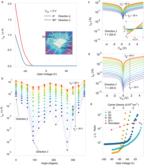 受晶格对称性的影响,晶体材料中热导率、电导率、介电常数、拉曼张量等基本物理量常常呈现出内禀的各向异性。例如,石墨中ab面内的电导率比面外(c方向)高三个量级,这种面内外的强各向异性在三维块体范德华材料中比较常见。近年来,随着二维材料研究的发展,各种面内的各向异性新现象不断涌现。其中,晶格对称性较低的二维范德华材料(例如SnSe、GeP等)的拉曼各向异性、电导率面内各向异性等现象受到越来越多的关注和深入的研究,基于此的原型器件也亟待设计和开发。然而,目前报道的二维极限下导电各向异性值(比如,面内某方向最大电导率与面内另一方向最低电导率的比值)均在10以内,数值偏小,不利于新型器件的开发应用。另一方面,能否通过某些快速方便的手段(例如门电压)来调控电学的各向异性,也是一个极具挑战性的问题。