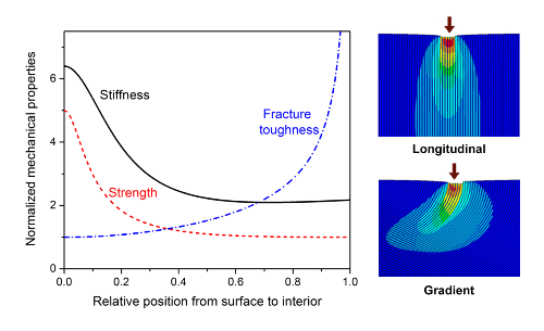 图1:梯度结构取向效应实现生物材料力学性能从表面到内部梯度变化规律,从而提高材料整体抵抗接触损伤的能力