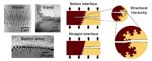图3:不同生物材料中的锯齿形多级“缝合”界面结构及其通过阻碍裂纹沿界面偏转而对界面起到增韧作用