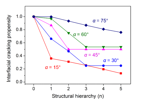 图4:具有不同锯齿尖锐程度的多级“缝合”结构界面的开裂倾向随结构级数的增加而逐渐降低