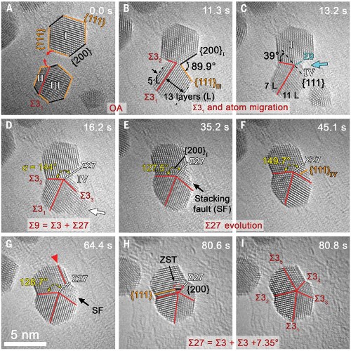图 1. 五重孪晶形成机理1:通过取向粘附、原子表面扩散以及随后的高能晶界的形成和分解(零应变孪晶成核和生长)