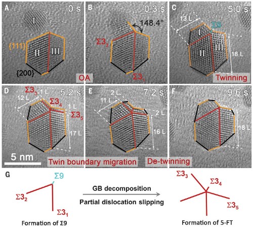 机理2:通过取向粘附和不全位错的滑移或晶界分解。当取向粘附过程形成的凹面夹角为~150°时,通过在表层原子中不全位错的滑移或Σ9晶界的分解即可实现五重孪晶的形成。不全位错的继续滑移可促使孪晶界面向晶粒内部迁移,但也伴随着晶格应变能增大,因此该机理主要形成不对称的五重孪晶结构。在后续的生长过程中,五重孪晶对称性的演化可通过与其他纳米颗粒的聚集长大实现。