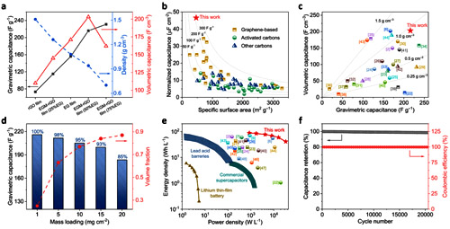 电化学电容器具有可快速充电、功率高、循环寿命长、工作温度范围宽、安全性能高等优点,可用作大功率电源,在混合电动汽车、备用电源、便携式电子设备等领域都具有广阔的发展前景。然而电化学电容器相比于电池其能量密度较低,即单位体积内储存的能量低,限制了其更广泛的应用范围,尤其是在便携式智能设备中的应用, 需要进一步提高体积能量密度。近日,金属研究所与英国伦敦大学学院及香港大学合作,在《自然-能源》(Nature Energy) 在线发表题为“可调层间距、高效孔利用石墨烯薄膜的电化学电容储能研究”(Tuning the interlayer spacing of graphene laminate films for efficient pore-utilization towards compact capacitive energy storage )的研究论文。