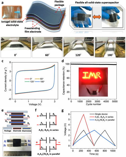 研究人员制备了不同比例的氧化石墨烯和热膨胀还原石墨烯的混合溶液,经过真空抽滤,得到片层间距可调节的复合石墨烯基薄膜。通过调控片层间距,实现了优化整个电极材料孔隙率的效果。当电极材料的孔隙尺寸与电解液的离子尺寸相匹配时,孔隙的空间利用达到了最优化,从而极大化了体积能量密度。在此基础上,科研人员设计了全固态柔性电化学电容器,石墨烯薄膜电极材料本身良好的弯折性能,保证了整个器件的柔性,并进一步发展了智能器件,通过根据实际需求改变电路连接方式,实现了不同的输出效果。