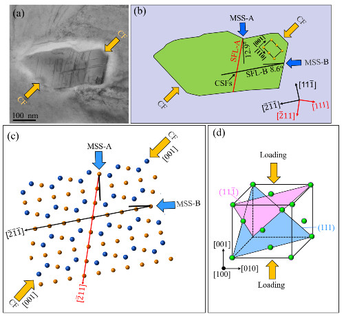 近期,金属研究所沈阳先进材料研究发展中心钛合金研究部李阁平研究组发现,Zircaloy-4合金在剪切变形后,合金中面心立方结构(C15)的Zr(Fe,Cr)2 Laves相纳米颗粒往往包含交叉堆垛层错,并且,交叉堆垛层错形成于面心立方结构的交叉密排面上。每个密排面上的堆垛层错结构可以描述为:面心立方结构的基体在层错区会引入密排六方结构的畴结构(Domain structure)。并且,由于Laves相的特殊结构,这些畴结构都是通过同步剪切(Synchroshear)形成的。不仅如此,李阁平研究组还特别关注了交叉堆垛层错的形成条件。通过标定纳米颗粒所在的α-Zr基体晶粒的位错,发现基体晶粒位错的驱动力与纳米颗粒的[001]晶向平行。再结合纳米颗粒的形状,可以认为此纳米颗粒受到单向压缩的载荷,载荷方向平行于[001]方向。众所周知,当晶体在单向压缩条件下,45度面会承受最大剪切应力,而交叉堆垛层错线与单向压缩模型下的45度最大分切应力所在平面具有较小的角度(<12.9°)。换句话说,当外载荷平行或接近[001]方向时,面心立方结构的交叉密排面上正好可以同时获得较大的分切应力,从而出现了交叉堆垛层错。