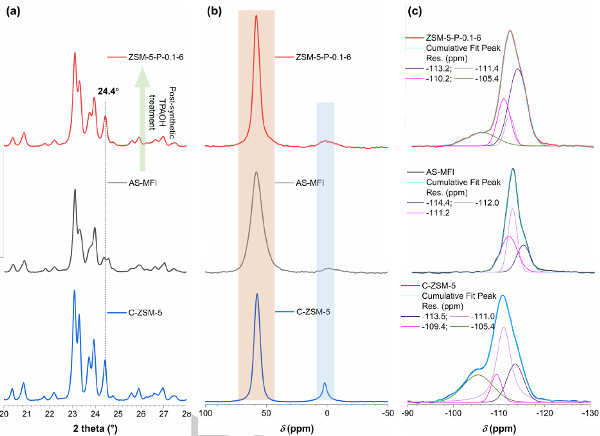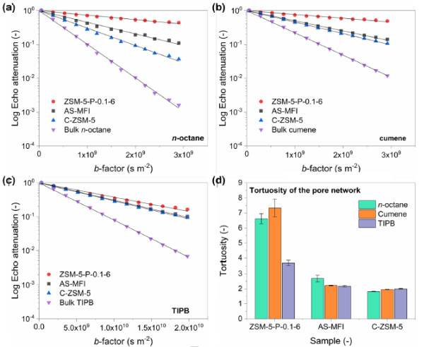 此项研究通过高温快速老化沸石合成母液制备出含有非骨架铝的沸石母相,而后,通过四丙基氢氧化铵溶解、再结晶将非骨架铝转化为骨架铝,同时形成中空结构。该方法的新颖性在于,采用含有非骨架铝的沸石作为母相,打破了四配位骨架铝对沸石溶解、再结晶的限制,从而制备出硅铝比低至16的中空ZSM-5型沸石。低硅铝比中空ZSM-5型沸石在碳氢化合物裂解中,尤其是在大分子碳氢化合物裂解中表现出高活性、高稳定性和高丙烯选择性的显著优势。通过脉冲场梯度核磁共振(PFG-NMR)研究了沸石催化剂的传质特性,表明低硅铝比中空ZSM-5型沸石优异的催化性能来源于大量的可接触酸性位。该方法不仅适用于合成低硅铝比中空ZSM-5型沸石,也为其它中空杂原子掺杂沸石合成提供了可行的技术路线。