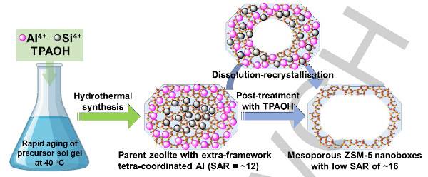 ZSM-5型沸石由于其微孔结构(0.51-0.56 nm)和可调变的固体酸特性,在石油裂解、石化产品精制方面发挥着至关重要的作用。由于沸石微孔限制反应物传质,近几十年以来研究重点一直是提高反应物对沸石酸性位的可接触性以提高其催化活性。通常采用碱液后处理选择性脱硅刻蚀出晶内介孔来提高沸石酸性位的可接触性。但是由于沸石母相中四配位铝对脱硅起抑制作用,这种方法只适用于合成硅铝比较高的ZSM-5型沸石,合成具有良好可接触性的低硅铝比ZSM-5型沸石仍是一个具有挑战性的课题。