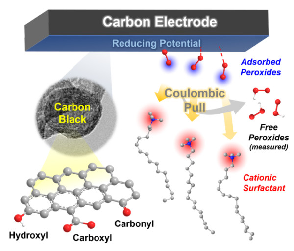 图1. 碳/表面活性剂体系催化氧还原反应高选择性生成过氧化氢的促进作用示意图。