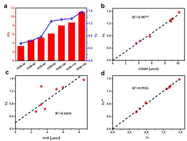 图2. 氧还原反应二电子选择性与碳材料表面含氧官能团(-COOH, C=O)数量之间的关系:动力学拟合和实验结果的对比。