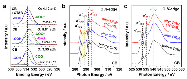 图4. 反应前后碳/表面活性剂体系的化学组成和结构:XPS O1s谱和NEXAFS C/O的K-edge谱。
