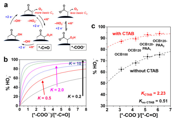 图5. 碳/表面活性剂体系催化氧气电化学还原反应机理和动力学分析:表面活性剂促进过氧化氢脱附。