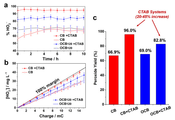 图3. 不同电催化剂体系对过氧化氢选择性和电位窗口宽度的比较:碳/表面活性剂体系的优势。