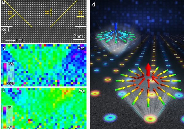 拓扑畴结构具有拓扑保护性,可使数据得以长时间保存,在非易失性信息存储方面具有重要应用价值。然而,铁电材料中的拓扑畴一般都包含本体对称性不允许的连续极化旋转。如何突破铁电极化与晶格应变的相互制约,实现极化反转与晶格应变的有效调控,获得有望用于超高密度信息存储的结构单元,是当今铁电材料领域面临的一个基础性科学难题。