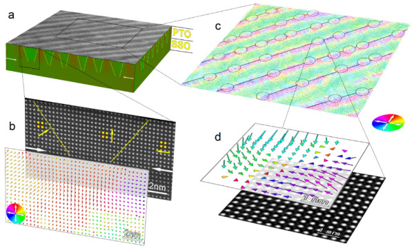图1:外延生长在SmScO3衬底上的PbTiO3超薄膜中会聚型半子的面内应变和晶格旋转信息(a, b, c);会聚型和发散型半子交替排列所形成的周期性半子晶格示意图(d)。