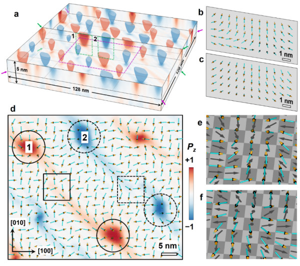 图3:半子晶格的相场模拟结果。(a)三维展示图;(b, c)汇聚型和发散型半子的截面极化矢量图;(d)半子和反半子的平面极化矢量图;(e, f)图d中两个半子的三维极化矢量图。
