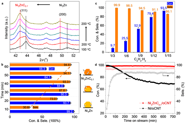 图3. Ni3ZnC0.7结构原位形成及其乙炔选择性加氢性能