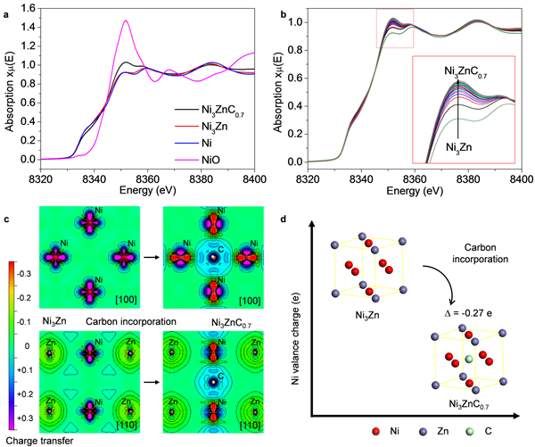 图4. Ni3Zn和Ni3ZnC0.7结构中镍的电子结构及其原位演变