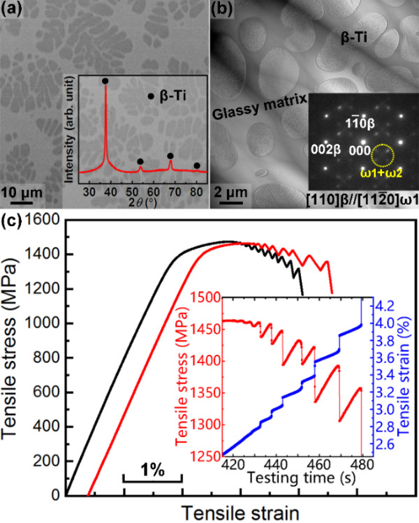 图1:非晶内生亚稳β-Ti复合材料的微观组织和拉伸应力-应变曲线