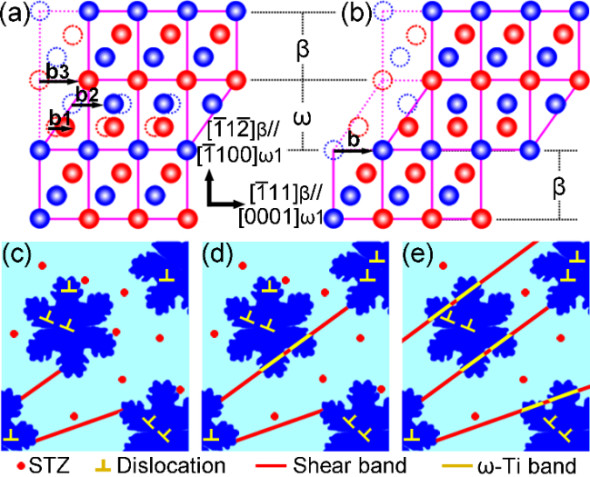 图3:β到ω的相转变以及非晶内生复合材料中剪切带与ω-Ti带的协同剪切机制