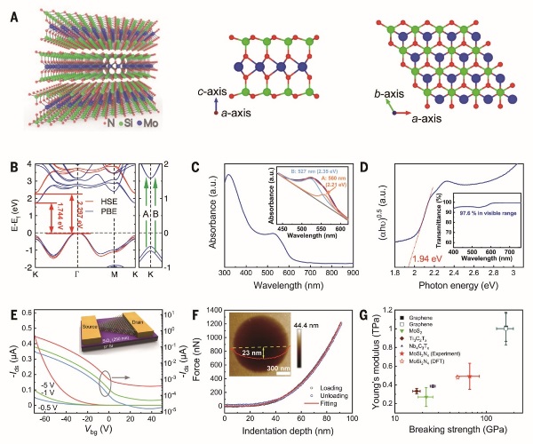 图3. 二维层状MoSi2N4的原子结构、电子结构、及光学、电学和力学性质