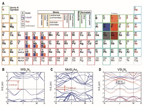 在此基础上,他们与我所陈星秋研究组和孙东明研究组合作,发现单层MoSi2N4具有半导体性质(带隙约1.94 eV)和优于MoS2的理论载流子迁移率,还表现出优于MoS2等单层半导体材料的力学强度和稳定性;并通过理论计算预测出了十多种与单层MoSi2N4具有相同结构的二维层状材料,包含不同带隙的半导体、金属和磁性半金属等。