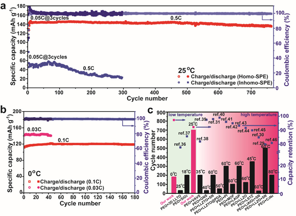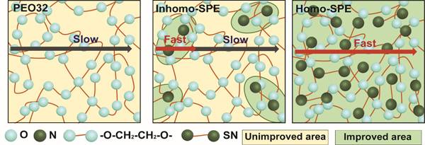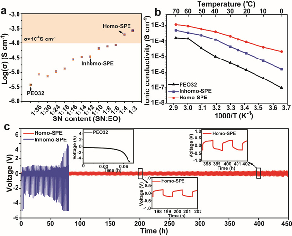 针对聚环氧乙烷基固态电池需要在较高温度(50-70°C)下使用,而在室温及低温下难以工作的问题,研究人员从锂离子传输的微观尺度出发,以有机小分子丁二腈(SN)替代常规的无机填料,通过调控丁二腈和环氧乙烷(EO)的摩尔比,在有效抑制聚环氧乙烷结晶并弱化环氧乙烷与锂离子结合力的基础上,实现了离子传输尺度上均质且快速的离子通路的形成。当丁二腈和环氧乙烷的摩尔比调控为1:4时,固态电解质的离子电导率提升了2个数量级,固态电池在室温和低温下(0°C)下也表现出优异的电化学性能。