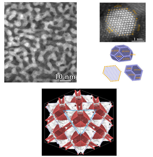 耀彩网沈阳材料科学国家研究中心纳米金属科学家工作室李秀艳研究员、卢柯研究员、周鑫特别研究助理与上海交通大学金朝晖教授合作,利用大量精细实验并结合模拟计算发现,当晶粒尺寸降低到几纳米时,纯金属铜多晶体会形成一种新型亚稳结构——Schwarz crystal(受限晶体)结构,这种具有极小界面(minimal interface)的三维结构表现出极高的热稳定性和力学稳定性,在纯铜的熔点以下不发生晶粒长大,其强度接近理论强度。这一重要发现表明除非晶固态外,多晶体金属在晶粒极细时还存在另外一种亚稳固体状态,其稳定性甚至远高于非晶固体。