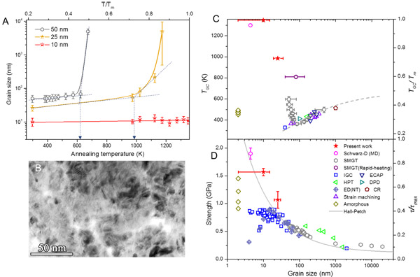 图2 A 晶粒尺寸分别为10nm、25nm、50nm的纯铜晶粒尺寸随退火温度的变化情况;B 纯铜受限晶体加热到接近熔点温度(1348K)晶粒尺寸没有明显变化;C和D分别为纯铜中晶粒粗化温度与强度随晶粒尺寸的变化图,受限晶体呈现出接近熔点的超高稳定性和接近理想强度的高强度。